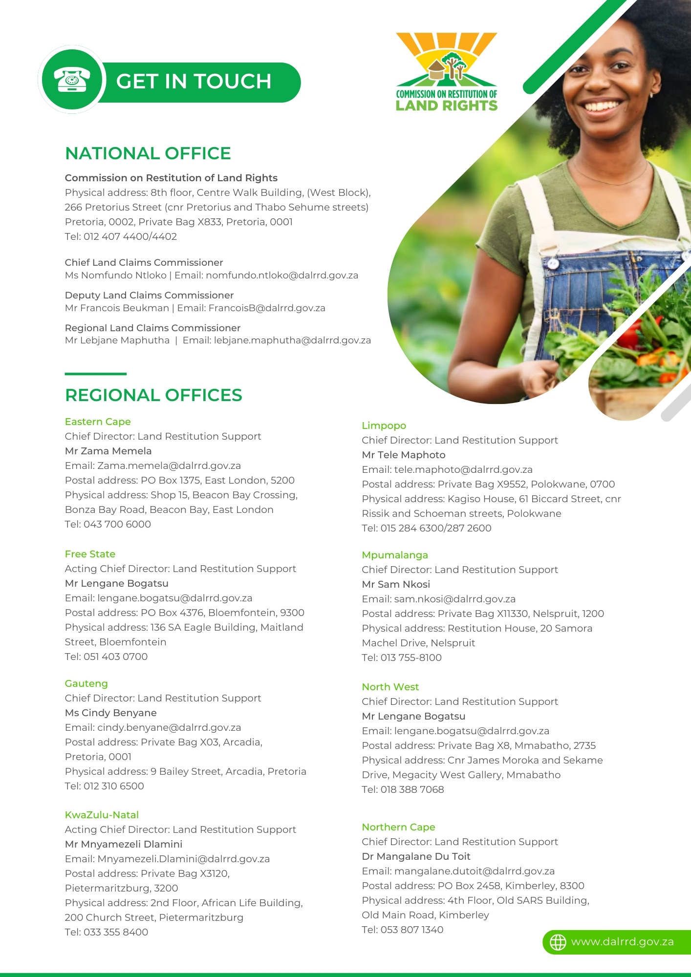 - Chief Directorates: Rural Infrastructure Development Region 1 (Eastern Cape, Kwa Zulu-Natal, Northern Cape and Western Can) and Region 2 (Free State, Gauteng, Limpopo, Mpumalanga and North West)